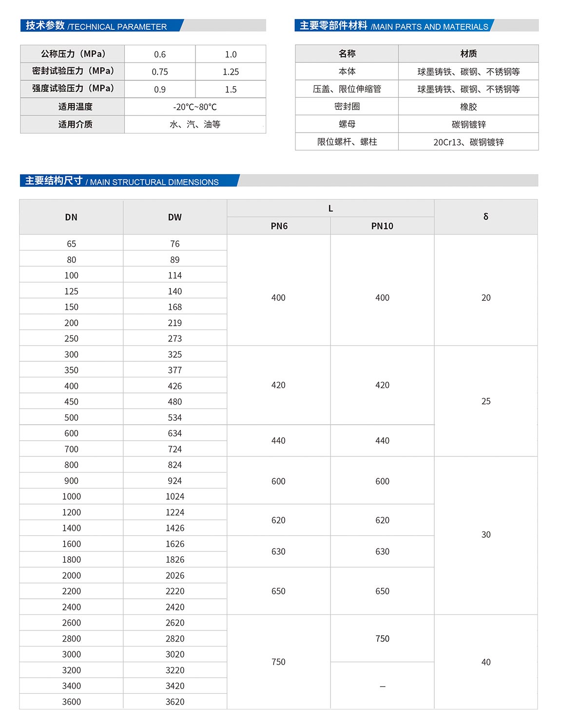 雙法蘭傳力接頭:由本體,密封圈,壓蓋,伸縮短管等主要部件組成。該產(chǎn)品適用于兩邊均為法蘭連接的管道中,安裝時(shí)調(diào)節(jié)產(chǎn)品兩端的法蘭的安裝長(zhǎng)度,對(duì)角均勻擰緊壓蓋螺栓,使其成為一個(gè)整體,并有一定的調(diào)節(jié)量,方便安裝維修時(shí),根據(jù)現(xiàn)場(chǎng)尺寸進(jìn)行調(diào)整。在工作時(shí)可以反軸向推力傳遞至整個(gè)管道。雙法蘭傳力接頭是由法蘭松套伸縮接頭和短管法蘭,傳力螺桿等構(gòu)件組成,能降低被連接件的壓力推力(盲板力)和補(bǔ)償管路安裝誤差。雙法蘭傳力接主要用于泵、閥門等附件的松套連接。