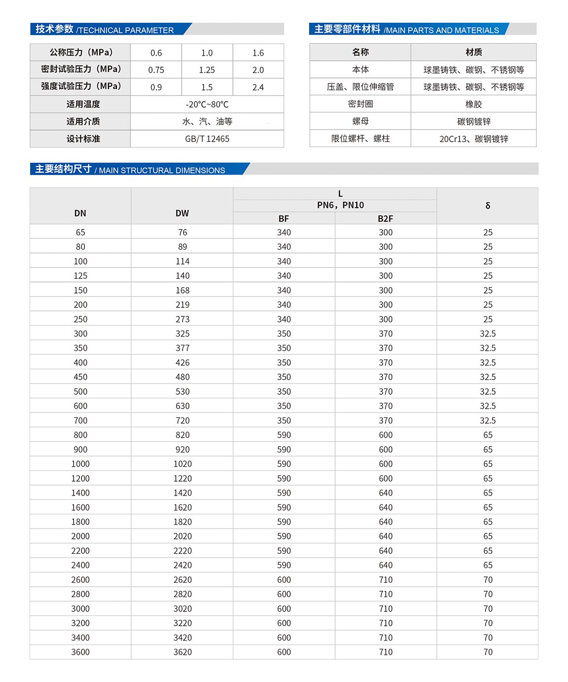 松套限位補(bǔ)償接頭安裝在管道上后,擰緊螺母,起到密封和連接作用。當(dāng)溫度變化時(shí),管子能在接頭中間自由地伸縮,當(dāng)?shù)鼗鲁?、偏斜,它均能確保密封無(wú)滲漏,從而達(dá)到自動(dòng)補(bǔ)償之目的。